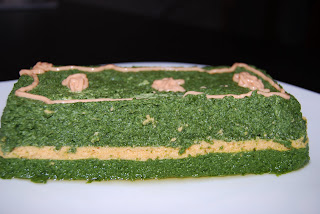 Cocer las verduras por separado. En este caso, al ser congeladas, en el microondas, excepto las zanahorias. Batir los huevos con la leche evaporada. Escurrir las verduras y trituralas junto a una parte de la mezcla (cada una formará una capa). Cuantas más capas y colores más bonito quedará. Echar una de las mezclas (en este caso la de acelgas) en un molde tipo cake. Poner en el horno al baño maría unos 20 minutos. Echar la siguiente capa, en mi caso la de zanahoria, y repetir la operación. Terminar con la última capa (espinacas) y volver a meter al horno hasta que esté hecho.